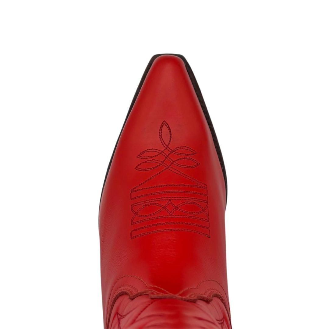 Women’s Valverde del Camino boots, handcrafted from intense red cowhide leather, featuring handcrafted embroidery and a premium finish. An elegant and bold design that combines comfort and authentic style. Ideal for standing out on any occasion, from everyday wear to special events. Slanted heel and stitched leather sole.