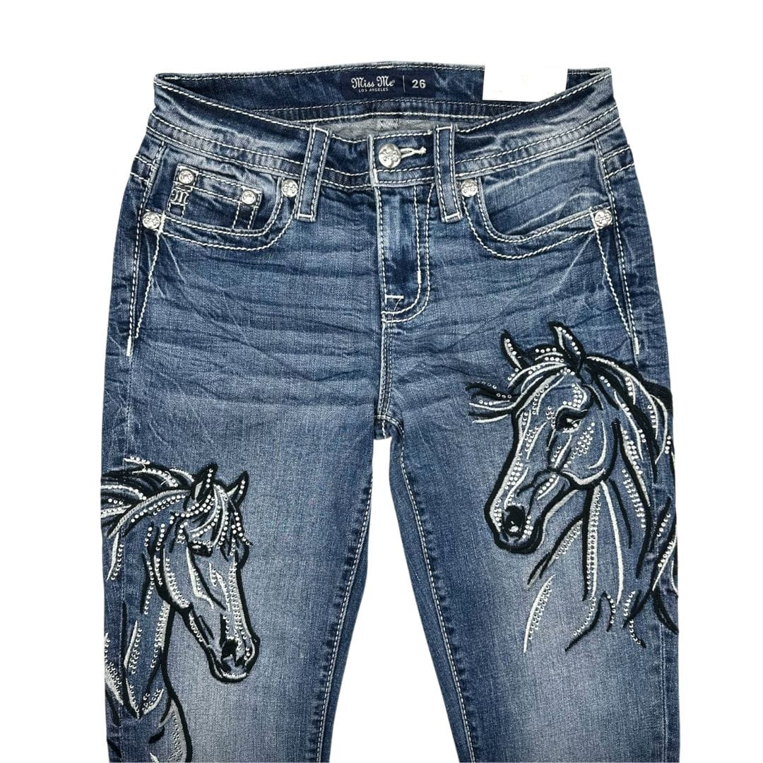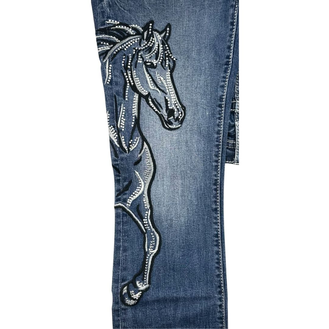 Jeans bootcut bleu clair et taille moyenne. Décorations brodées de chevaux sur les jambes avec petits brillants. Sequins et rivets en strass. Modèle 5 poches.