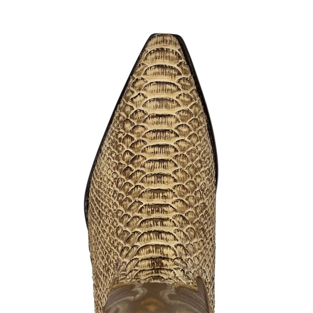 Sendra Boots para hombre, elaboradas a mano en una combinación premium de piel de vacuno y pitón natural, que aporta un acabado exclusivo y sofisticado. Su diseño en tonos marrón, amarillo envejecido y pespunte decorativo en la caña, creando un contraste elegante y artesanal. Un modelo de lujo que une carácter, calidad y auténtico estilo western. Suela de cuero y cosido Goodyear.