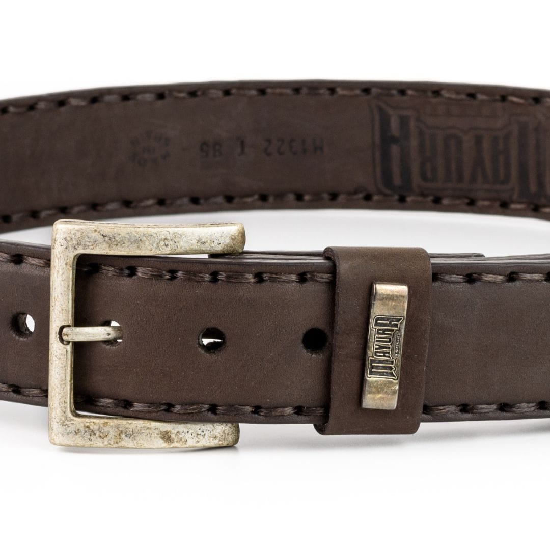Cinturó exòtic Mayura Boots fet en cuir boví color marró de la millor qualitat, 4cm dample, cosit a mà. Decoració amb xapons metàl·lics i cosits a contrast. Sivella intercanviable mitjançant sistema de botons a pressió.