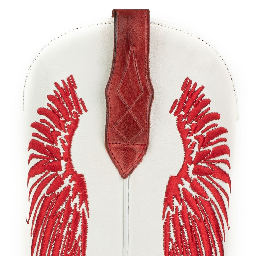 Bota Mayura Boots de dona, de pell boví vermella amb canya en pell apelfada molt suau color blanc i brodat “Wings” en vermell. Sola de cuir i cosit Goodyear.