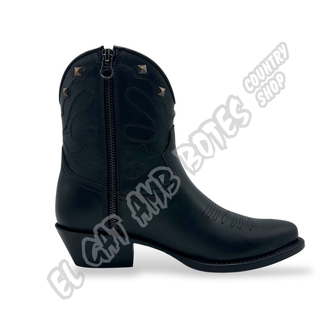 Mayura Boots mitja canya de dona, de pell bovina en to negre engrassat. Amb cremallera interior per a més comoditat en calçar-se. Detalls brodats i petites tacques metàl·liques que aporten caràcter, a més d'una punta arrodonida i elegant. Ideal per a un look versàtil i modern. Sola de cuir i cosit Goodyear. Model exclusiu que només trobaràs a les nostres botigues.