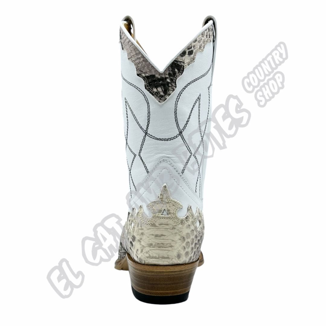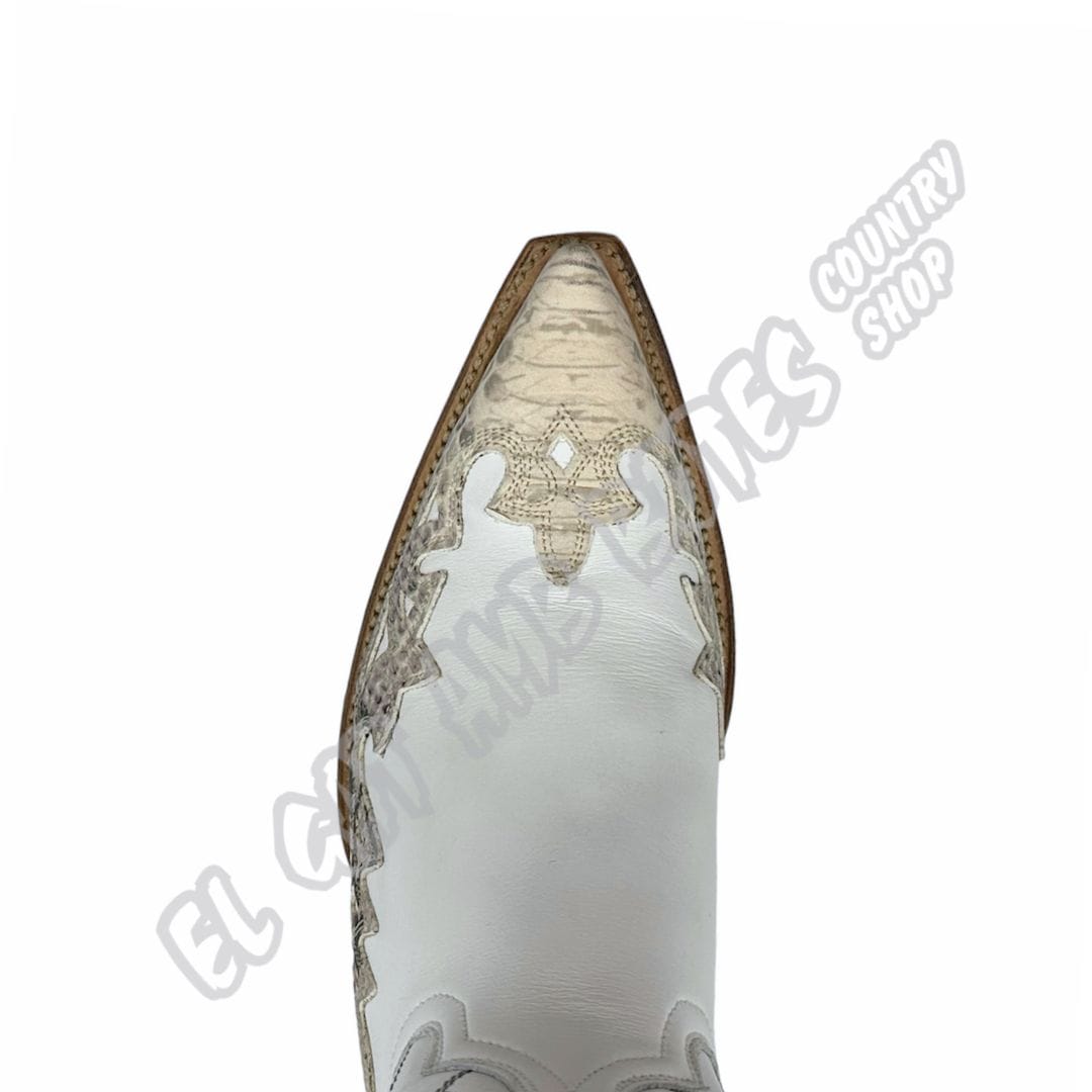 Bota mitja canya Sendra Boots de dona, de pell boví blanca combinada amb imitació pitó al detall de la canya i el peu. Perfectes per emportar amb faldilla o shorts. Model actual i molt còmode sense renunciar al teu estil. Sola de cuir i cosit Goodyear.