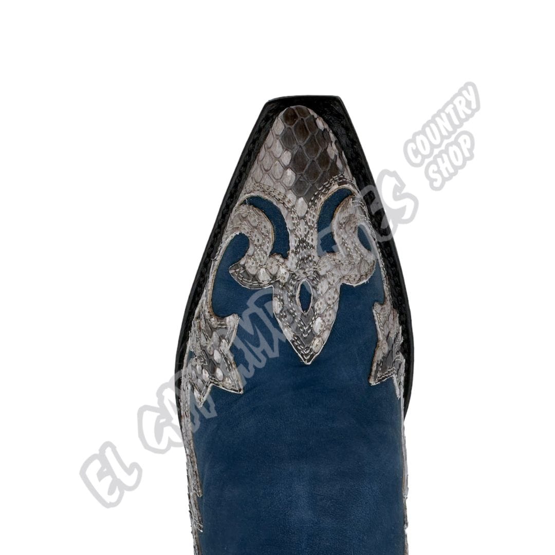 Bota mitja canya Sendra Boots de dona, de pell boví blau raspat combinada amb imitació pitó al detall de la canya i el peu. El lleuger raspat li dóna un toc envellit que les fa úniques. Sola de cuir i cosit Goodyear.