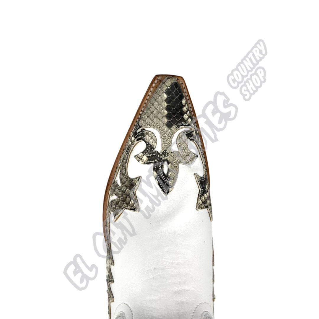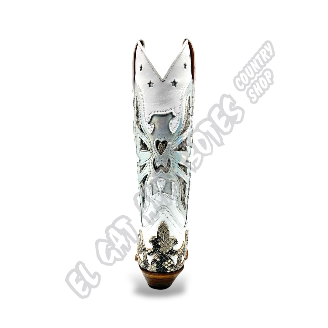 Sendra Boots bota alta estil cowboy. Comodíssima pell boví napa blanca amb brodat i detalls en autèntica pell de pitó. A la canya disseny d'àliga de pell platejada i detalls d'estrella. Sola de cuir i cosit Goodyear.