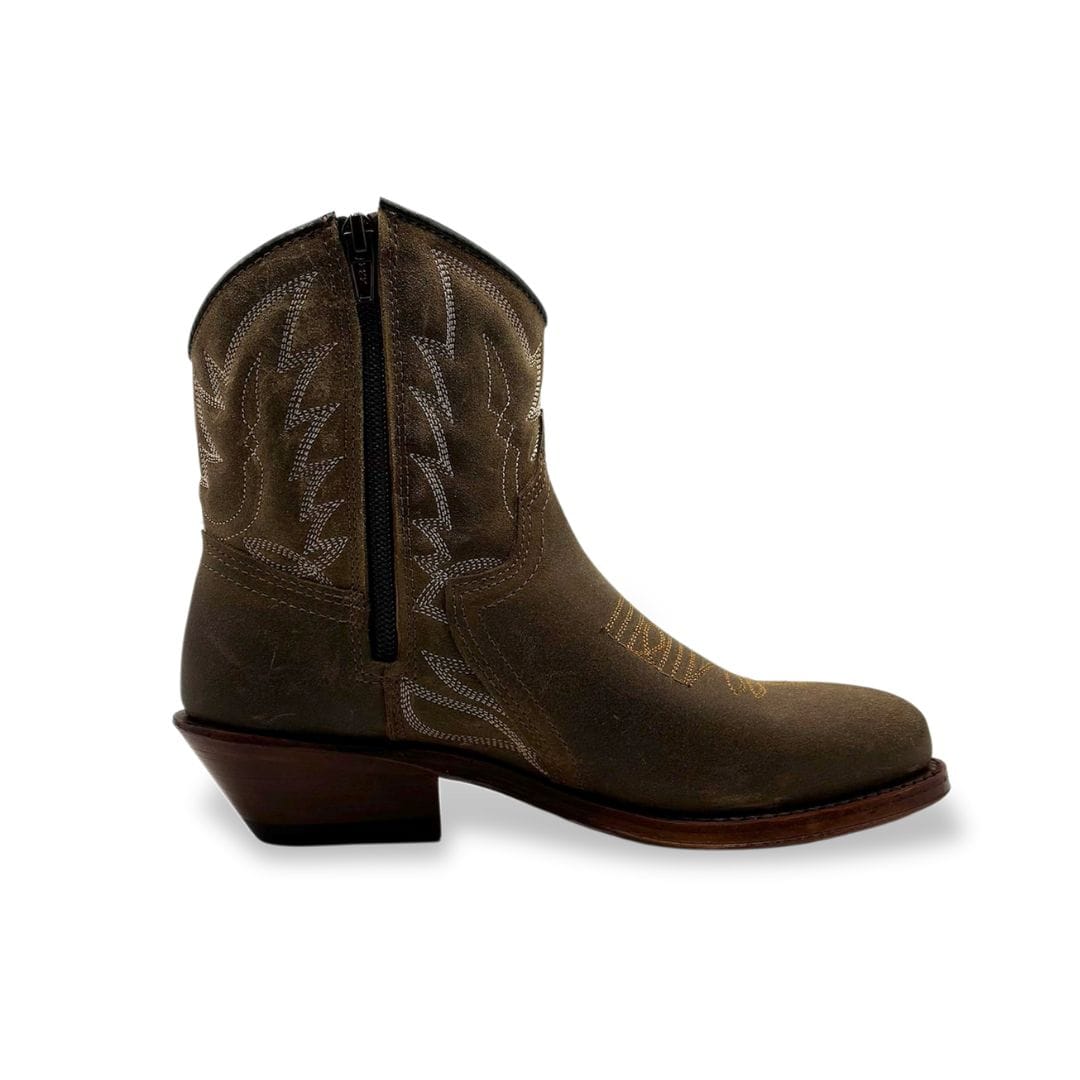 Botí per a dona Valverde del Camino fet a mà amb serratge de boví de color marró. Cremallera lateral per a més comoditat a l’hora de calçar-se i punta arrodonida. Adornades amb el clàssic pespunte a l’empenya i en contrast a la canya. Taló lleugerament inclinat i sola de cuir cosida.