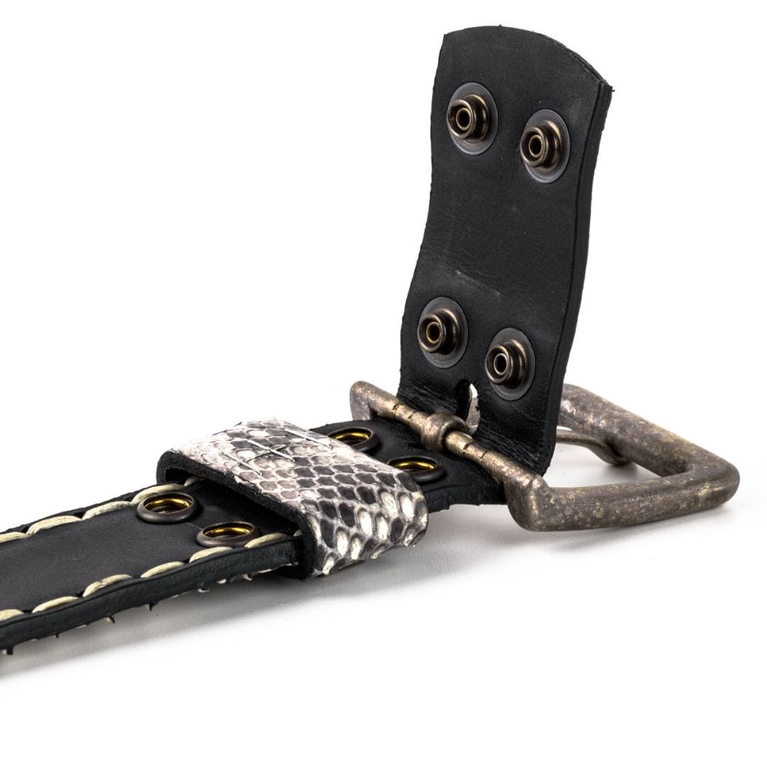 Exotic belt Mayura Boots Made in black cowhide leather of the best quality, 4cm wide, hand stitched. Decorated with "bull" style metal studs and genuine python leather. Interchangeable buckle with snap-button system.