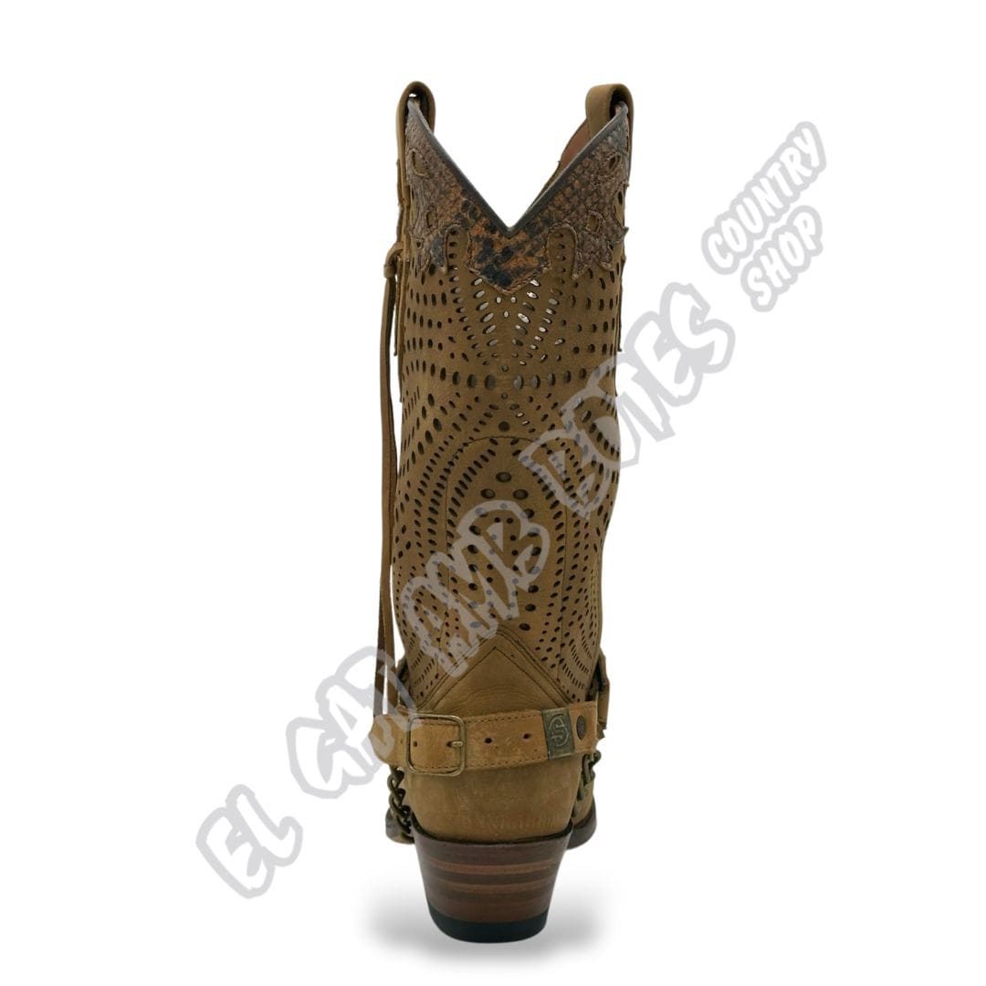 Sendra Boots women's cowhide leather in a lightly brushed brown tone. Western style with a sophisticated touch. Featuring a perforated shaft with python print detailing, side fringe and a decorative harness with rivets and chain. Leather sole and Goodyear stitching.