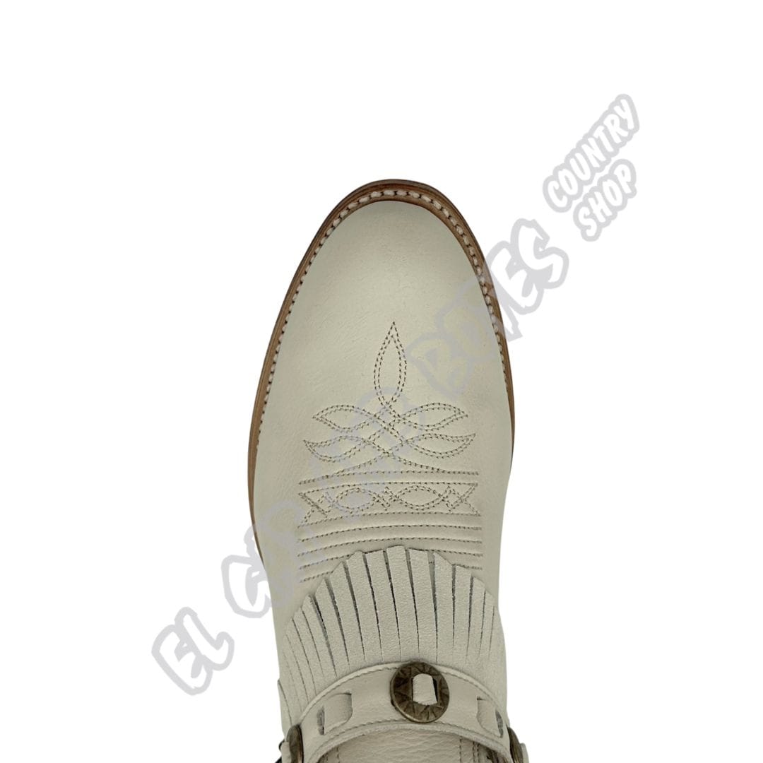 Sendra Boots for women, made of cowhide leather in avorio - ice tone. Western style with a sophisticated touch. Featuring a perforated shaft with python print detailing, side fringe and a decorative harness with rivets and chain. Leather sole and Goodyear stitching.