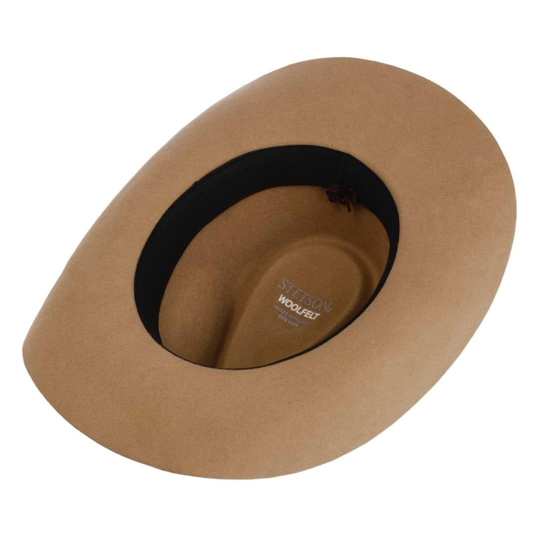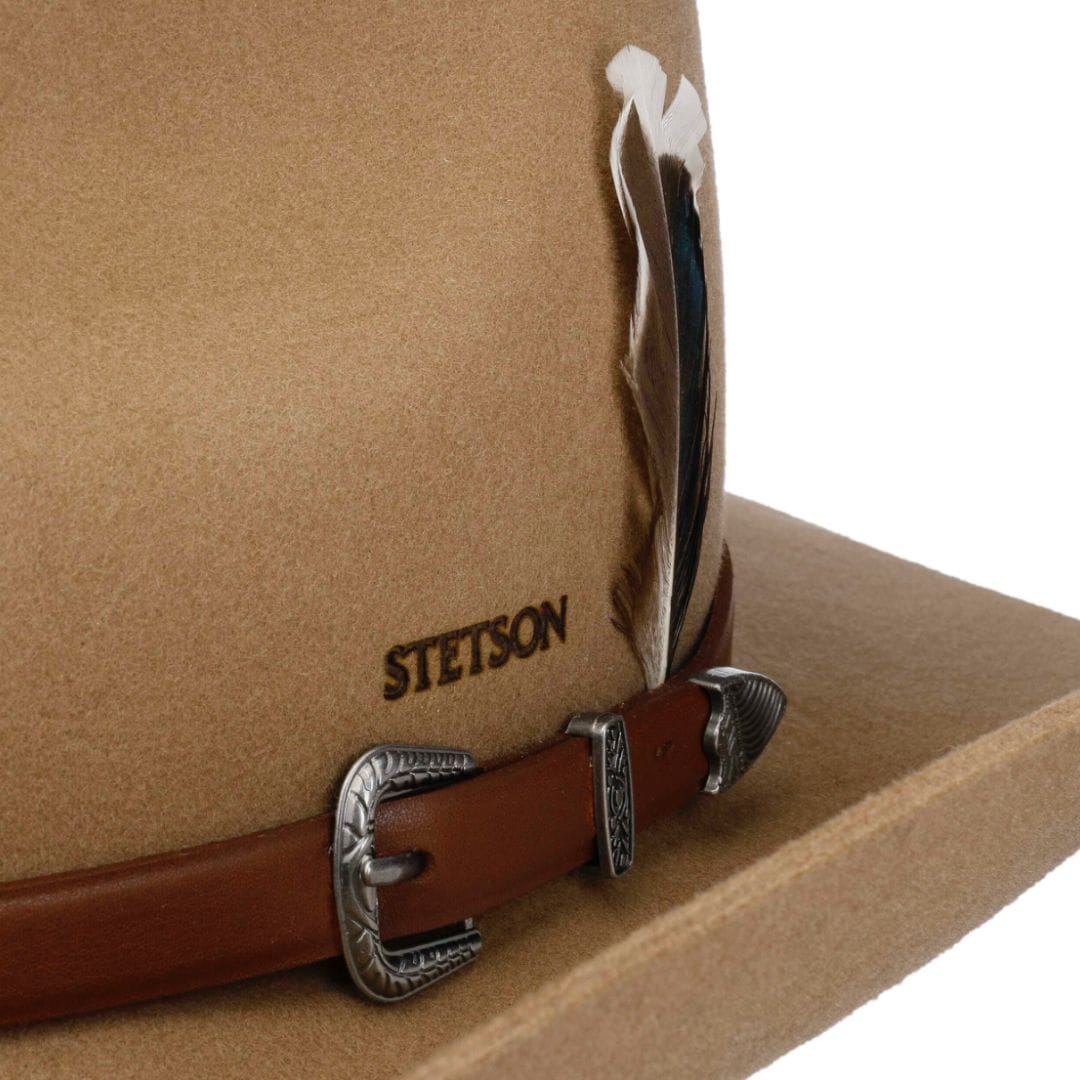 Timeless elegance meets authentic character in the Stetson Western Woolfelt hat. Crafted from 100% Australian sheep wooland naturally water-repellent, this model offers a soft, warm, and durable texture—perfect for Western style enthusiasts who value quality. Its carefully shaped Teardrop crowncreates a classic and sophisticated silhouette, while the generously wide brim adds both style and protection. The genuine leather band, adorned with a decorative metal buckle, enhances its premium Western appeal. Inside, comfort takes center stage with an ultra-soft sweatband, designed to provide lasting ease even during long hours of wear. The final touch is the engraved STETSON logo on the side—a hallmark of legendary craftsmanship in hatmaking.