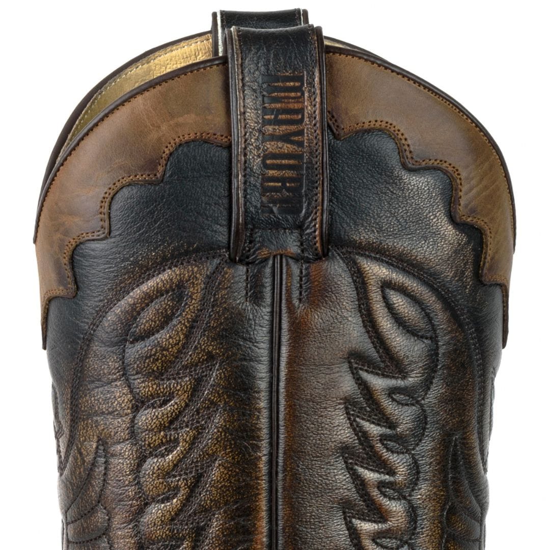 Botte Mayura Boots pour hommes, en cuir de vachette combiné à du cuir marron avec un effet usé. Aigle brodé sur la tige et décorations tribales sur le bout du pied. Semelle en cuir et coutures Goodyear.