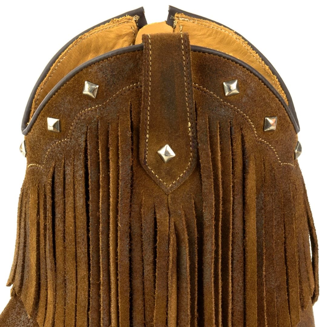 Bottine Mayura Boots pour femme, en cuir de vachette marron d'aspect vintage et vieilli, avec ses franges et ses bordures métalliques, qui lui confèrent un look urbain actualisé pour un usage intemporel. Fermeture éclair latérale intérieure pour plus de confort lors de l'enfilage des chaussures. Semelle en cuir et coutures Goodyear.