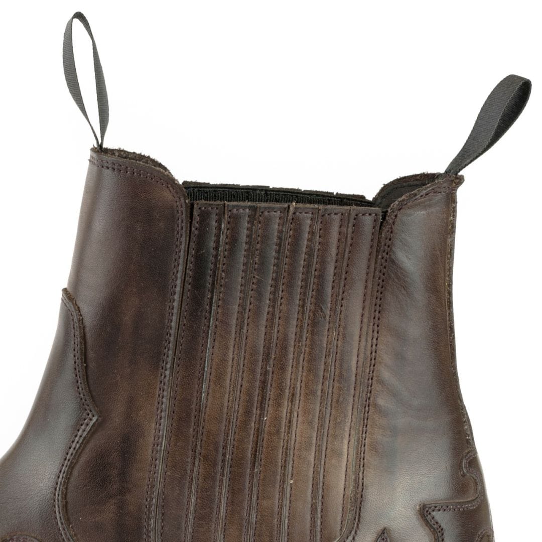 Bottines Mayura Boots pour homme, confectionnée en cuir de vache marron, au look vieilli et finition artisanale. Élastique sur la tige pour un plus grand confort lors de l’enfilage et un ajustement parfait à la cheville. Semelle double en cuir avec couture Goodyear.