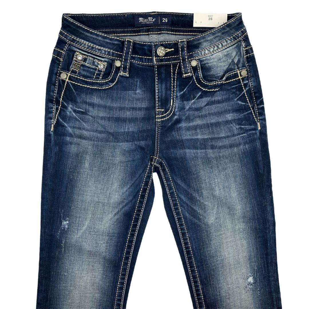 Jean bootcut à taille moyenne, délavage foncé. Avec paillettes et clous, et poches arrière à faux rabat en bleu et marron décorées de broderies blanches, de rivets et de strass. Modèle avec 5 poches.
