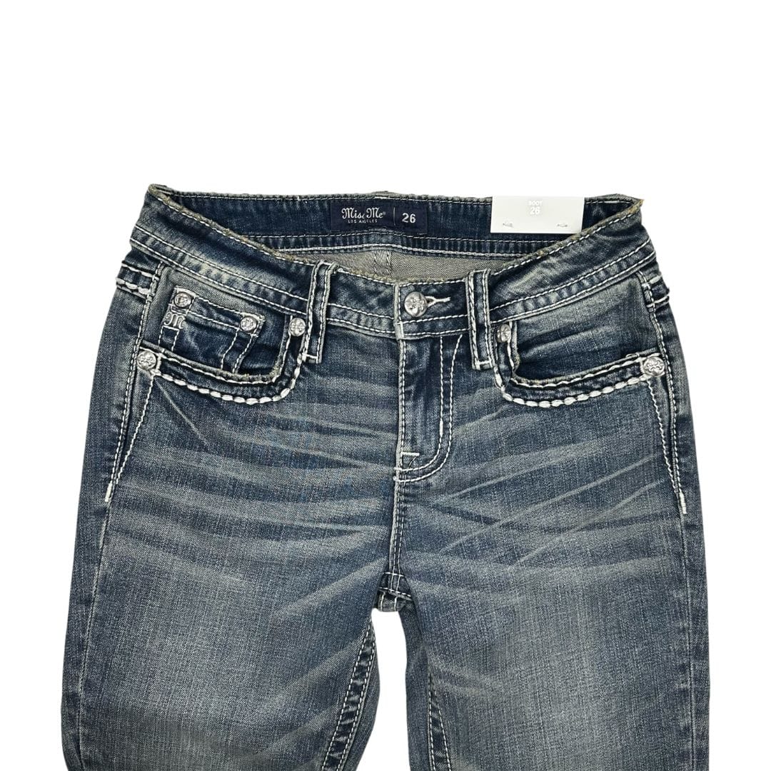 Jean bootcut bleu effet usé et taille mi-haute. Surpiqûres blanches et brillantes sur les poches arrière et avant. Sequins et rivets en strass. Modèle à 5 poches.