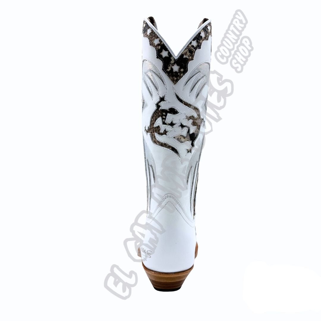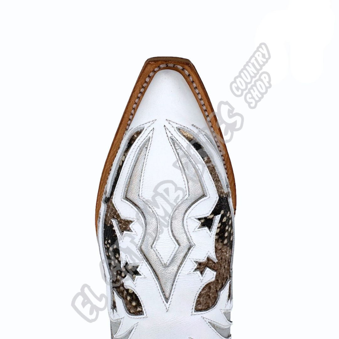 Botte Mayura Boots en cuir de vachette et en cuir de cheval blanc véritable avec des taches brunes. Semelle et coutures en double cuir Goodyear.