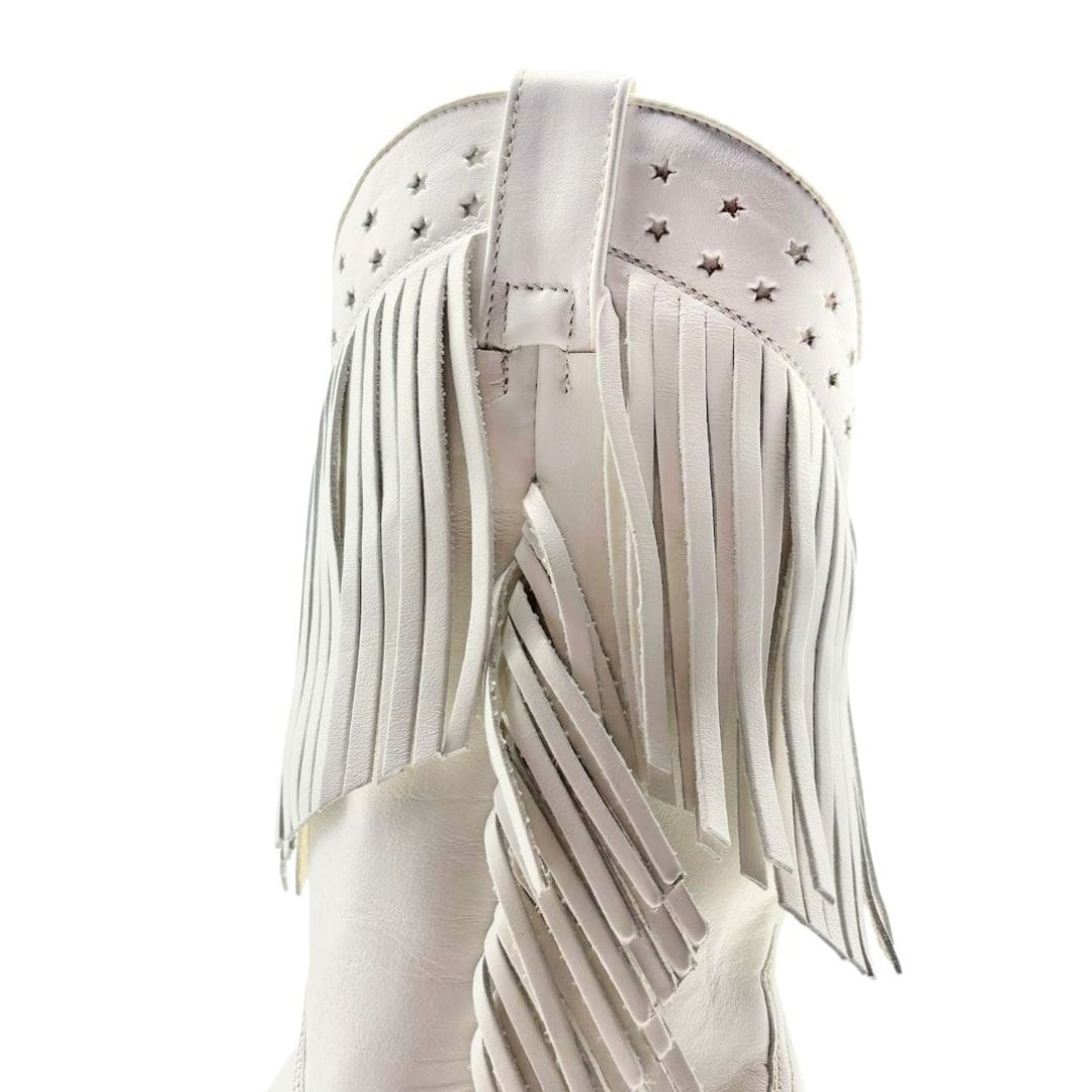 Sendra Boots pour femmes, confectionnées à la main en cuir de vachette de haute qualité. Leur élégant coloris blanc et leurs franges donneront du mouvement à vos looks les plus western. Semelle en cuir et couture Goodyear.