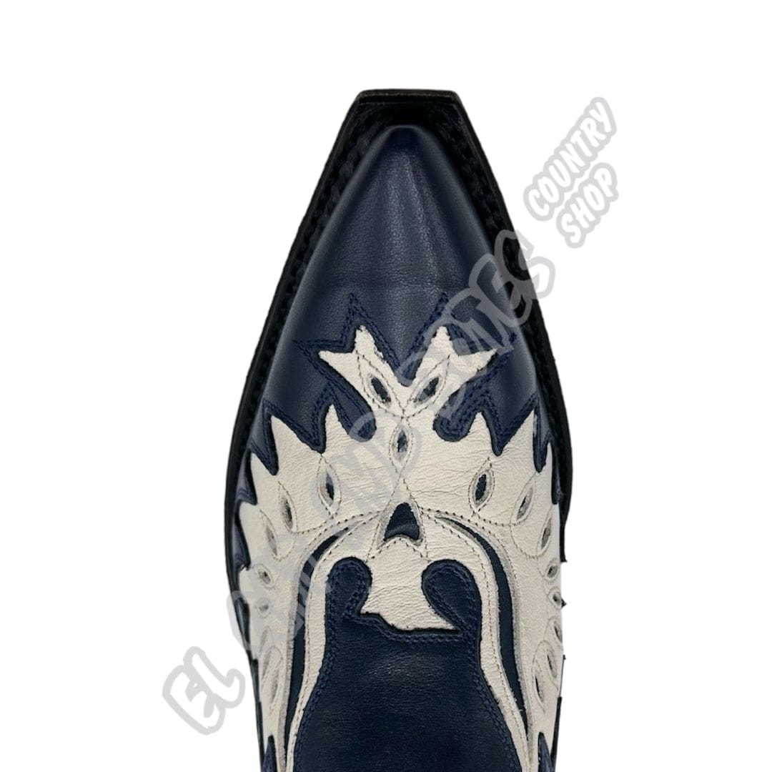 Botte Sendra Boots pour femmes, en cuir bleu marine avec détail d'aigle sur le cou-de-pied et à l'arrière en couleur glace. Semelle en cuir et coutures Goodyear. Modèle exclusif que vous ne trouverez que dans nos magasins.