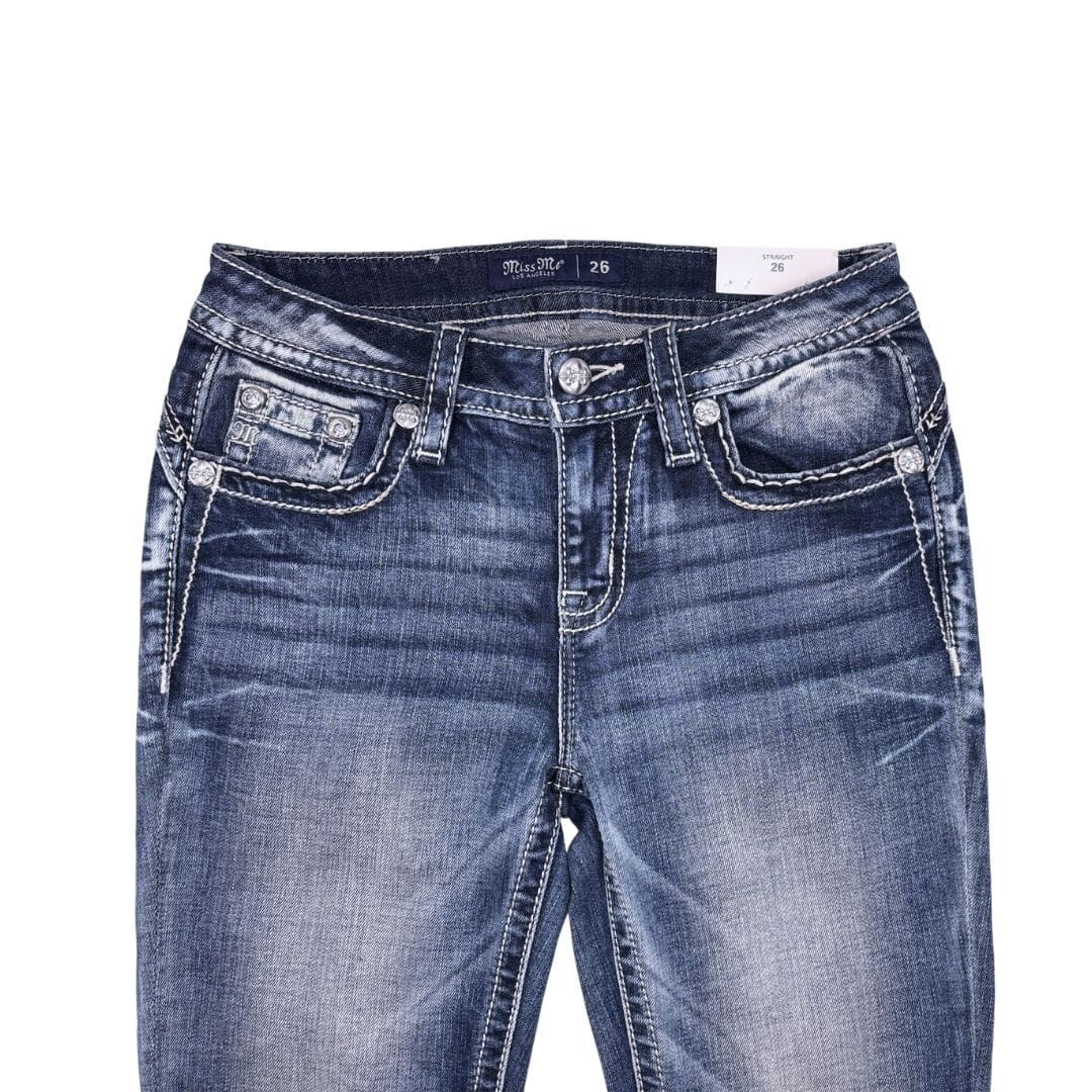 Jeans Rectos azul efecto usado y tiro medio. Motivos aztecas con pespuntes en tonos beige, blanco y azul en bolsillos traseros. Lentejuelas y remaches de strass. Modelo 5 bolsillos.