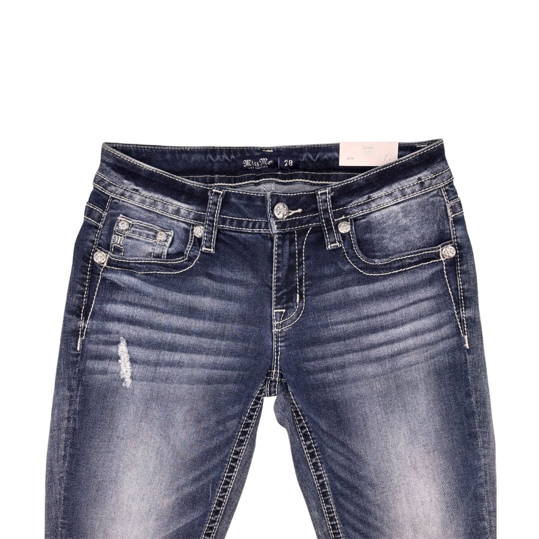 Jeans Skinny azul desgastado y tiro bajo. Flor en símil de piel y bordados en blanco, azul y plateado en bolsillos traseros. Lentejuelas y remaches de strass. Modelo 5 bolsillos.