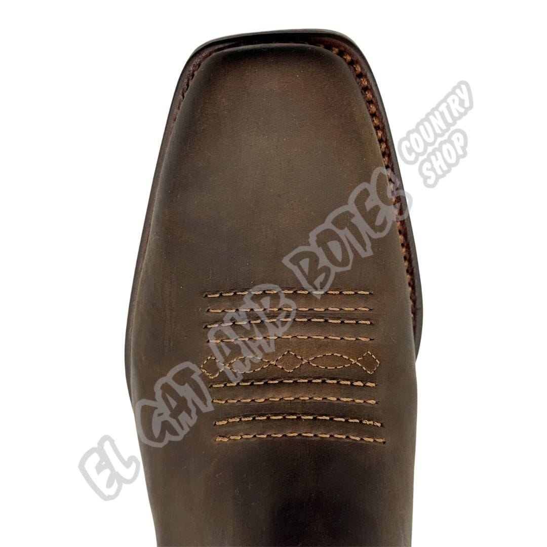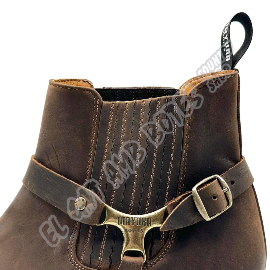 Botín punta cuadrada Mayura Boots de hombre, confeccionada en piel vacuno engrasada de primera calidad. Plantilla interior acolchada, arnés decorativo ajustable y elásticos laterales para un ajuste perfecto. Suela de cuero y cosido Goodyear. Exclusivo modelo que solo encontrarás en nuestras tiendas.