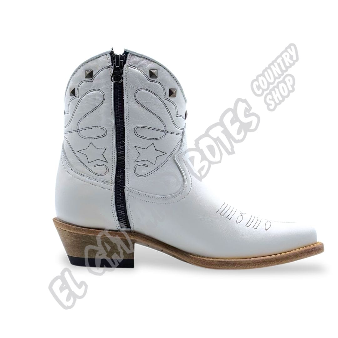 Mayura Boots botín de mujer, confeccionada en piel vacuno blanca con bordados a contraste en la caña y aplicaciones metálicas de estrella en el pie y los tiradores. Suela de cuero y cosido Goodyear. Exclusivo modelo que solo encontrarás en nuestras tiendas.