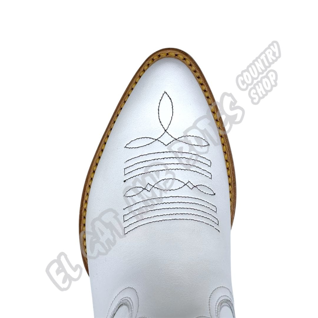 Mayura Boots media caña de mujer, de piel vacuno en tono blanco. Con cremallera interior para más comodidad al calzarse. Detalles bordados y pequeñas tachuelas metálicas que aportan carácter, además de una punta redondeada y elegante. Ideal para un look versátil y moderno. Suela de cuero y cosido Goodyear. Modelo exclusivo que solo encontrarás en nuestras tiendas.