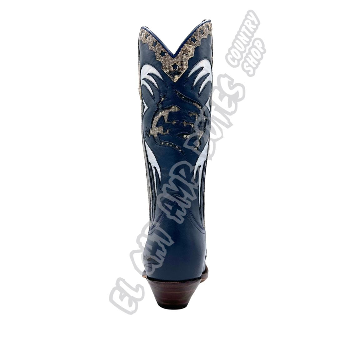 Sendra Boots bota alta estilo cowboy. Comodísima piel de serraje azul marino con bordado y detalles en auténtica piel de pitón. En la caña diseño de águila en piel plateada y detalles de estrella. Suela de cuero y cosido Goodyear. Exclusivo modelo que solo encontrarás en nuestras tiendas.