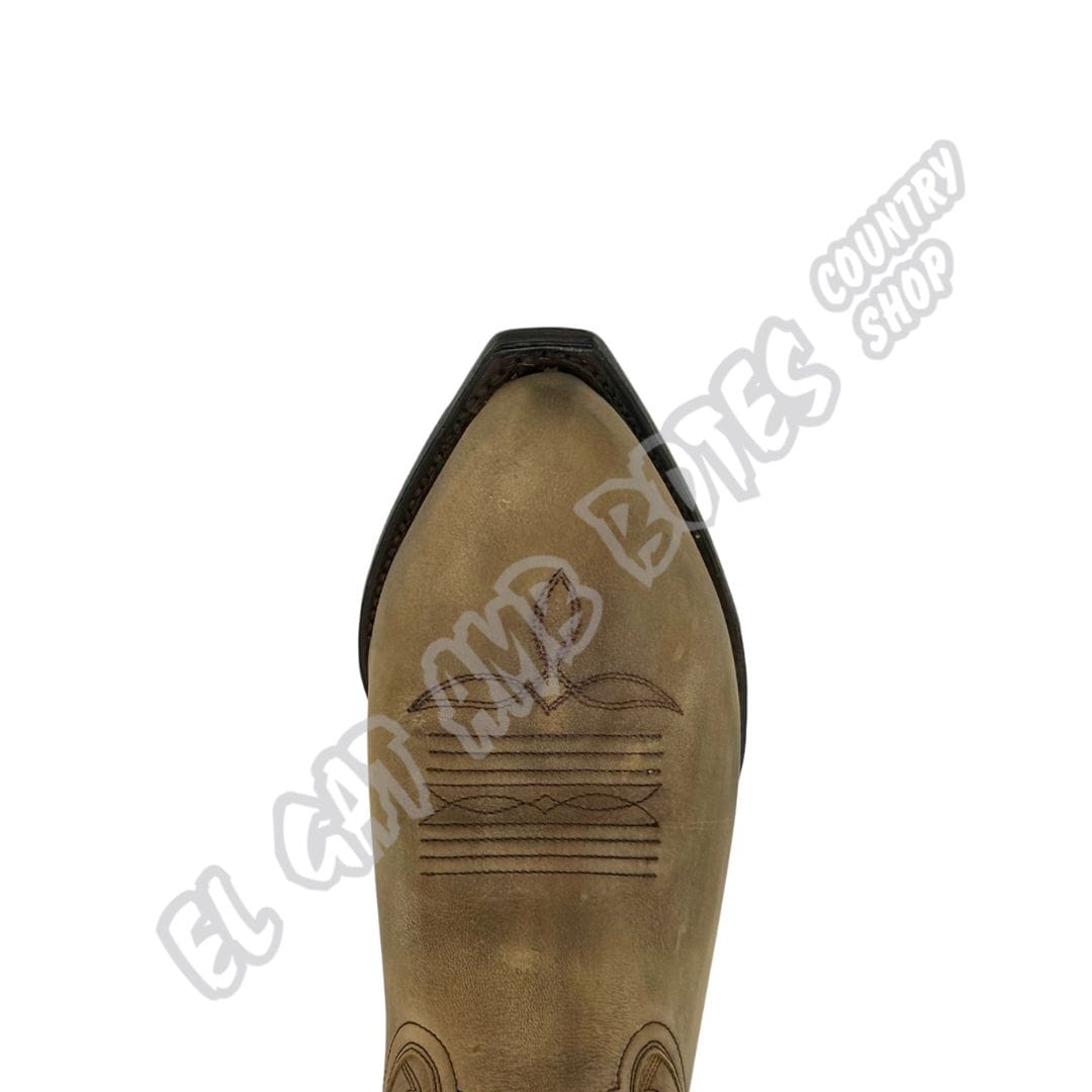 Sendra Boots media caña de mujer, de piel vacuno en tono marrón envejecido. Déjate seducir por su elegancia rústica, diseño clásico y bordados artesanales en pie y caña. Suela de cuero y cosido Goodyear.