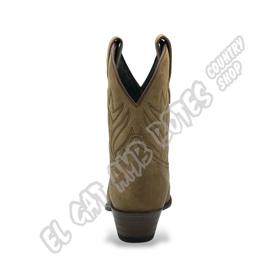 Sendra Boots media caña de mujer, de piel vacuno en tono avorio envejecido. Déjate seducir por su elegancia rústica, diseño clásico y bordados artesanales en pie y caña. Suela de cuero y cosido Goodyear.