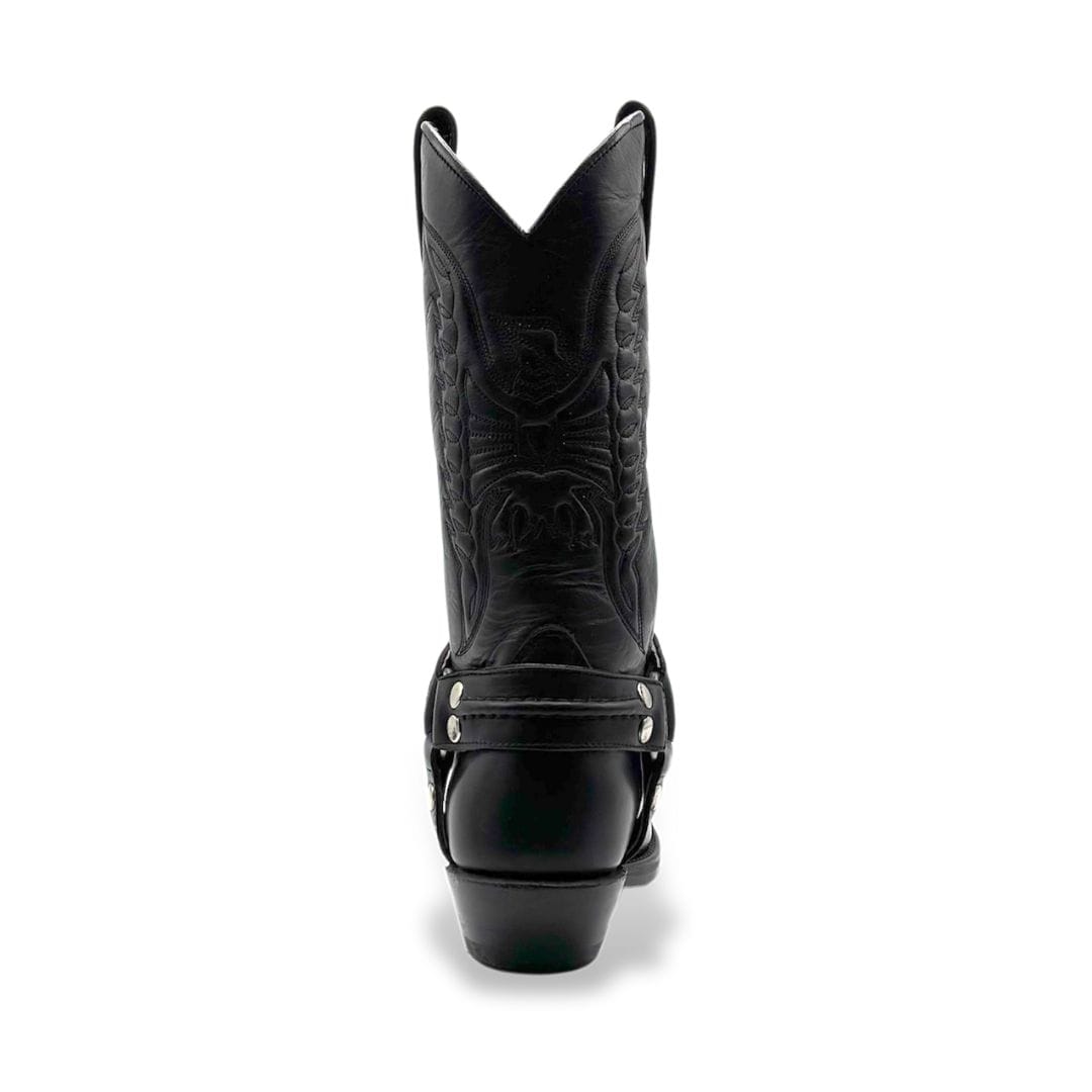 Sendra Boots para mujer estilo Biker, confeccionadas a mano en piel vacuno de alta calidad. Elegante color negro brillante y costuras artesanales en caña y empeine. El arnés cosido y la punta cuadrada le darán el punto extremado a tus looks. Suela de cuero y cosido Goodyear.